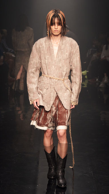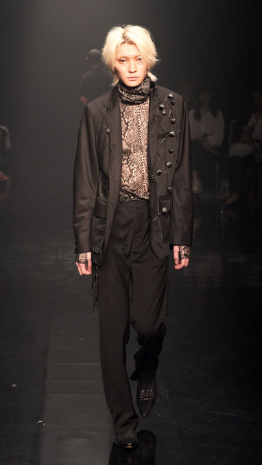 The nihilistic decadence of Almost Transparent Blue provides a fertile playground for Akatsukigawa’s artisanal approach. His tireless attention to detail was evident in a collarless jacket made with intricate jacquard fabric, constructed to reveal deliberate frayed edges along each meticulous cut. Literal fireworks flew onstage in the finale, as the show concluded with his signature deconstructed take on a Mao suit. Adorned with a smattering of black flowers and detachable sleeves pulled down nonchalantly off the shoulders, the look was a resounding coda that amplified the decadent atmosphere.