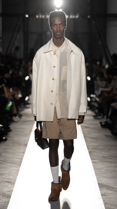 The show opened with a black goat leather ensemble, pairing shorts with a long jacket executed in a distinctive mesh macramé. Conventionally used to weave bags, the technique was reportedly adopted out of Kawakami’s admiration for the handiwork of Indian craftspeople. This respect toward craftwork served as a poignant storyline throughout the collection.