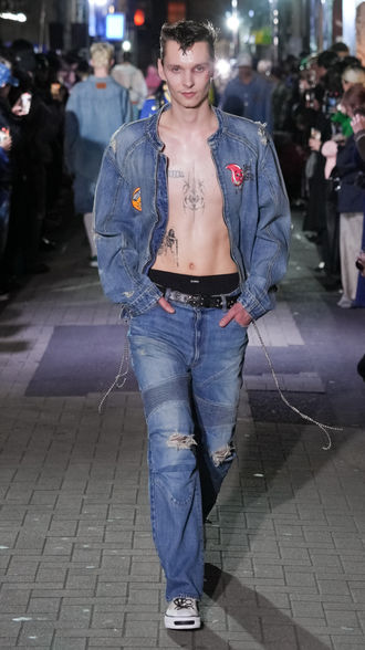 A gritty Shibuya back alley provided an appropriate backdrop for this season’s models, their tattooed chests and bruised faces (makeup, of course) blending in with those of the youth gangs who have long prowled these streets. The show unfolded in an aggressive succession of iconic bad boy staples such as torn jeans, oversized leather jackets, ankle-length coats, and unevenly faded hoodies, accessorized with turbans and ball chains. While these individual looks invited viewers to take a walk on the wild side, the collection still struck a balance with a subtle yet unmistakable air of elegance as a whole.