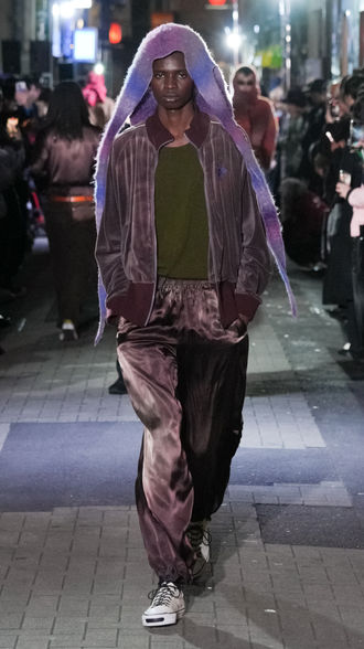 When formulating the collection, designer Koji Kamiya said he sought to explore the dual themes of “impulsiveness” and “universality.” A tall order, it would seem, to simultaneously balance a hedonistic surrender to the zeitgeist with an absolute aesthetic sense impervious to the shifting tides of time. Yet Kamiya managed to collapse time, seamlessly sublimating these covalent binaries into something that resembles yet transcends “street style.”