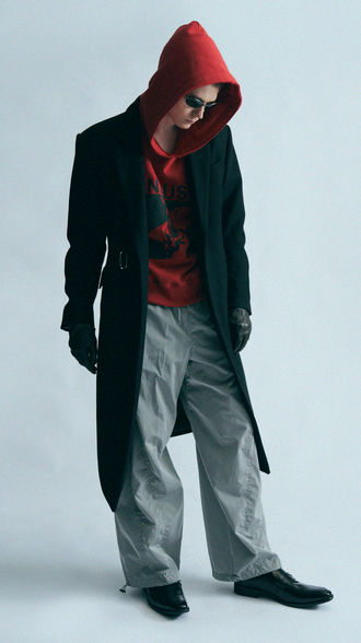 This season’s collection, titled “INDUST” after its industrial theme, emerged from a contemplation of the distance between the artificial and natural world. The story began with the Dobermann Pinscher, a breed created to function as guard dogs, symbolizing mankind’s artificial control of nature. By extrapolation, Hashimoto next turned his attention to industrial Germany, then the German national soccer team uniforms and the Porsche 911. This acrobatic leap across wide-ranging references is perhaps one factor that sets Hashimoto apart from other Japanese designers.