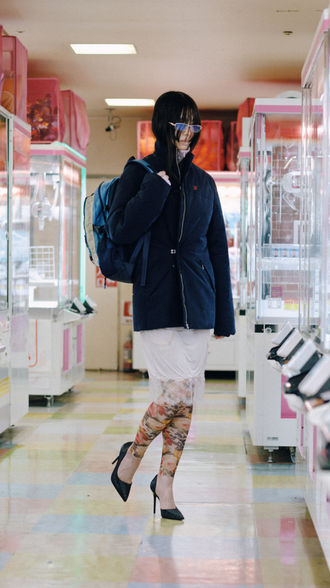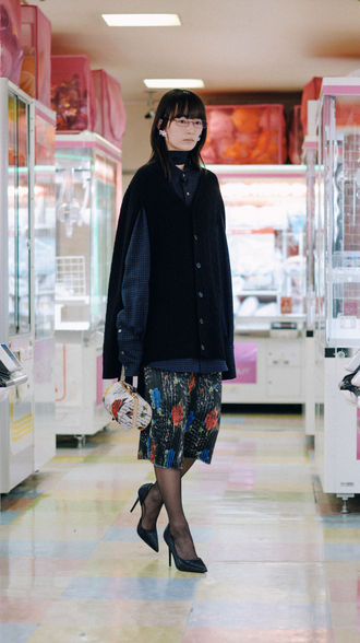 An Ikebukuro amusement complex, Rosa Kaikan, was chosen as the venue for the new collection. Contrasting the gaming arcade used as a runway, the eye-catching use of a repetitive rose motif drew inspiration from the building’s logo. Designer Keisuke Yoshida also wove elements of his own everyday life into the designs, bringing a touch of reality to elegant pieces with deep links to the non-everyday. There was a quilting jacket with hints of the pattern on his French bed mattress, while a belted coat had faithful reproductions of the carpet at his parents’ home.
