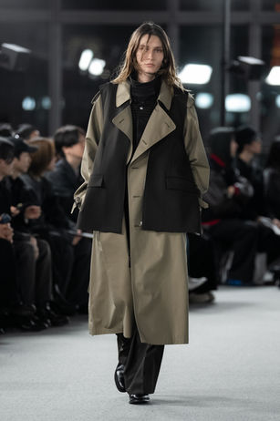 This season’s collection—the brand’s first to be presented in front of an in-person audience—unfolded on an elliptical runway with a lineup gravitating around solemn black. The brand leaned into its signature monochrome mood with an even more austere palette than past seasons, which had been accented with eye-catching pops of color.