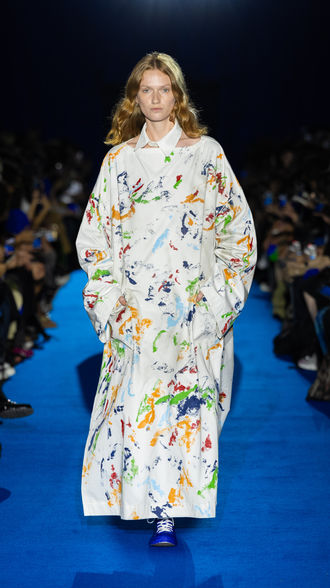 The first thing that came to mind was not so much a pop-up book as a pop-up collection. Because though the season did indeed take inspiration from Achromatic City, a picture book Shinya Kozuka wrote in his early twenties, the collection itself seemed to have almost literally jumped out of the pages of the book, bringing elements of it to life: the pictures created by the painter protagonist, the clothes the characters wear, the invitation to the colorful other world that the protagonist in the titular achromatic city receives, and the bright blue carpet that covers the catwalk in the fashion show that appears later in the story. Kozuka effectively reconfigured and remade his picture book, which then became the basis forinto this collection.